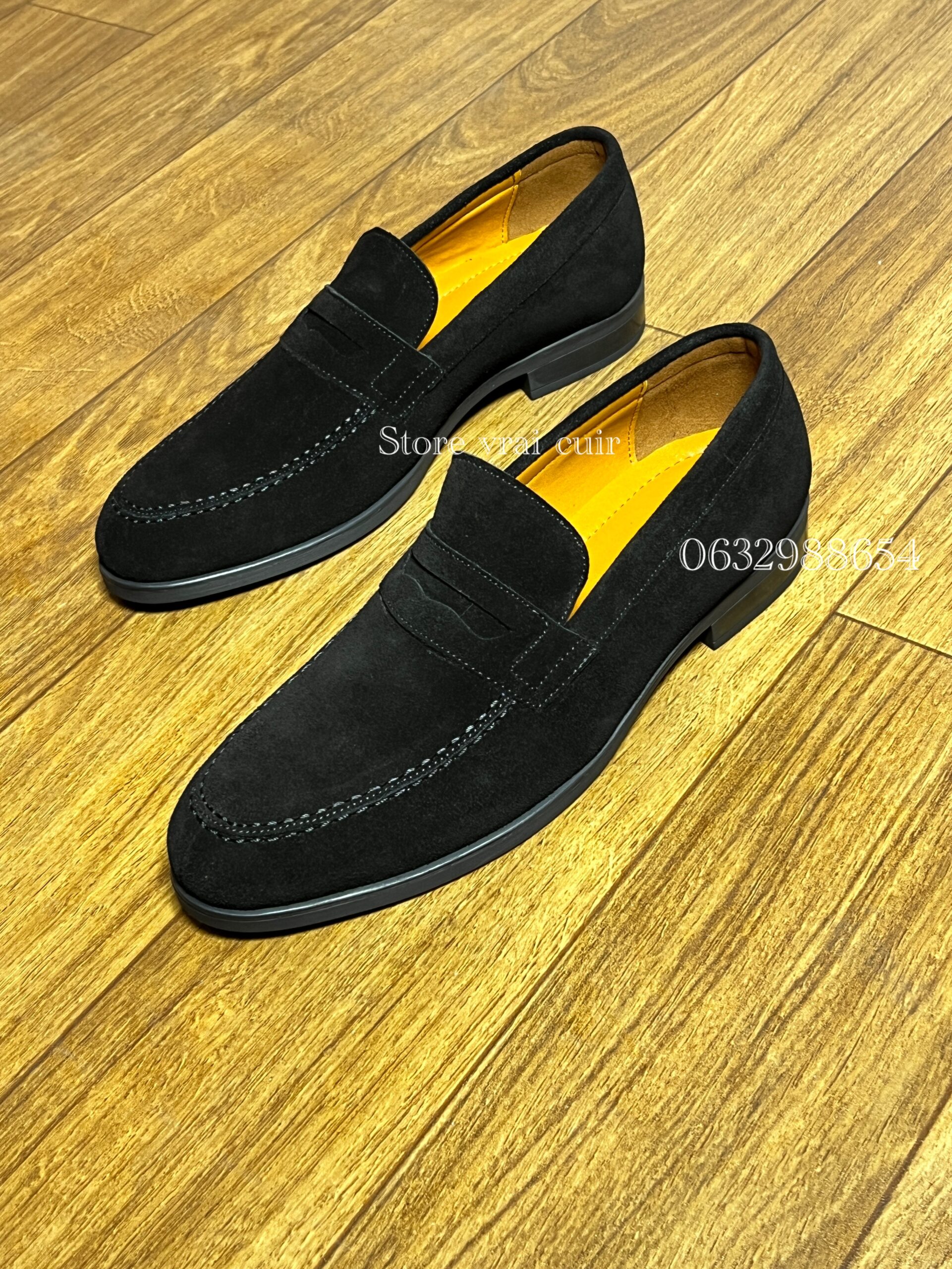 Daim noir + diam bleu marine. La semelle en gomme 100% cuir intérieur et extérieur